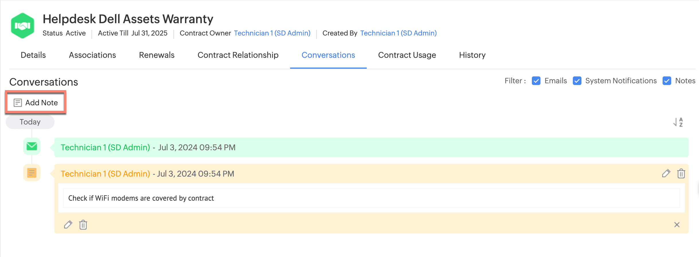 Go to Contracts and click on a contract to navigate to the contract details page. The contract details page has the following tabs: Details: You can view details of the contract, vendor, attachments, support details, and renewal details. You can add ...