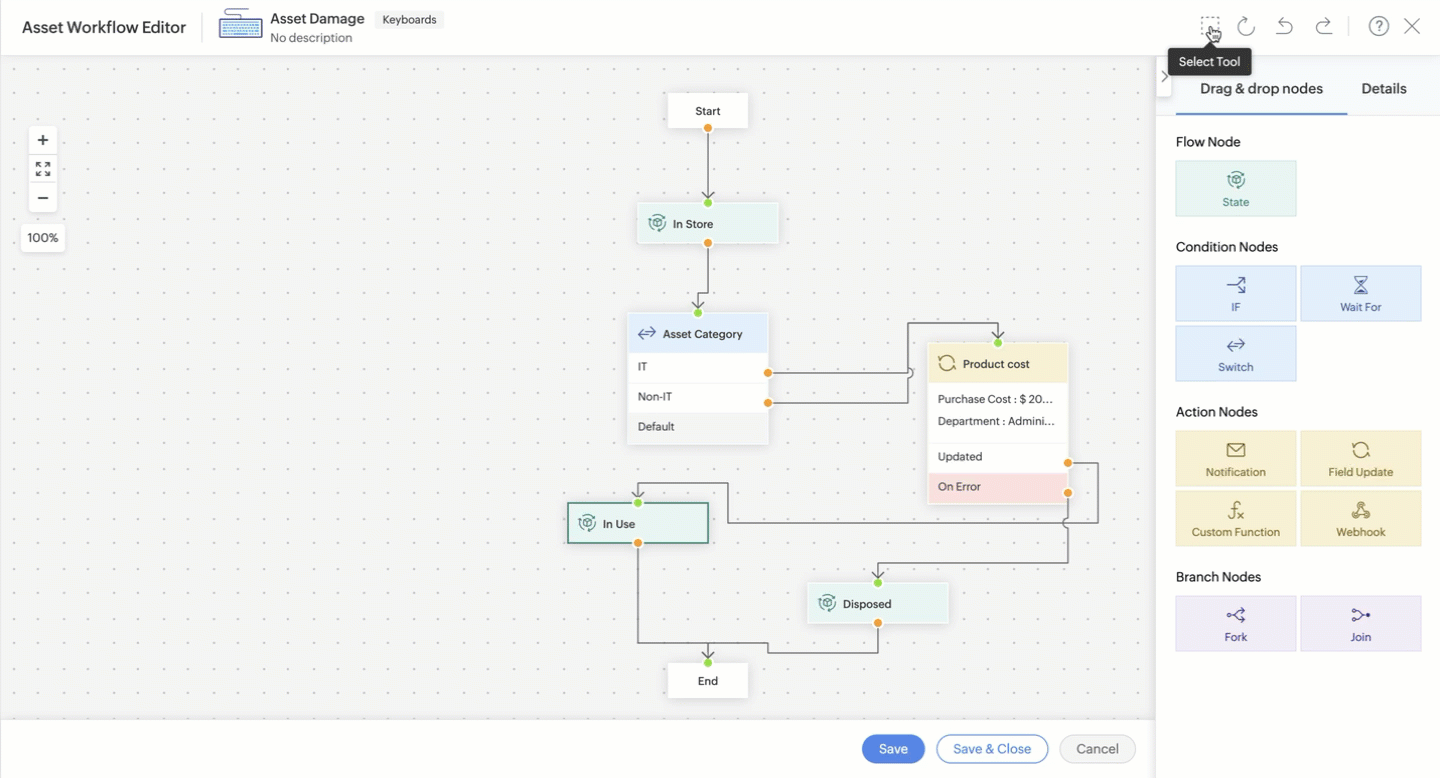 The State node lets you add asset states to your workflow. Drag State into the canvas and select the required state from the drop-down.You can have multiple states in a workflow.