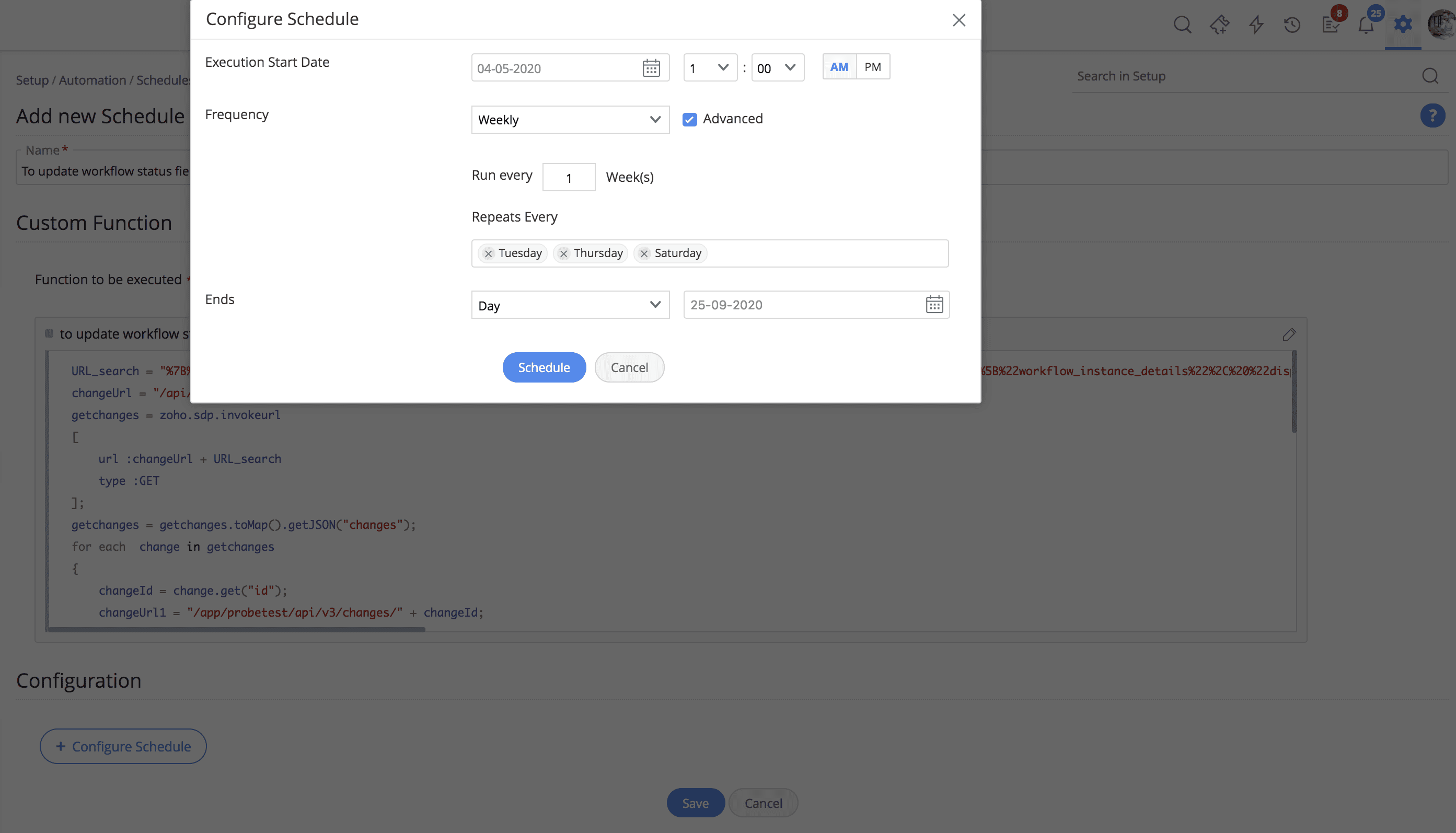 - Select from existing Functions: Click Create Custom Function. Provide a name and description. Add the script to the editor and click Save and Choose. The custom function saved will be added to scheduled functions.