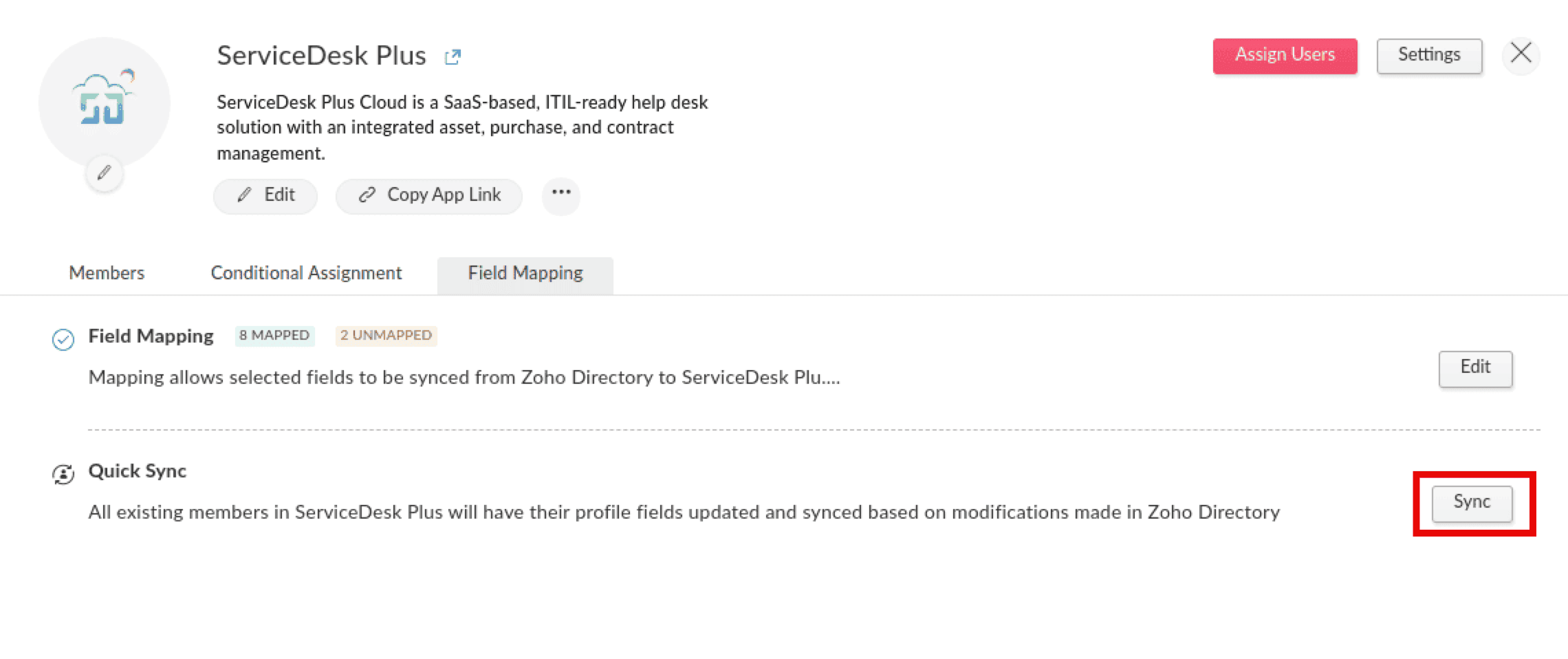 - Go to Zoho Directory > Admin > Applications > ServiceDesk Plus > Field Mapping.